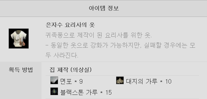 요리에 필요한 은자수 요리사의 옷을 제작하기 위한 1차 재료 계산 !