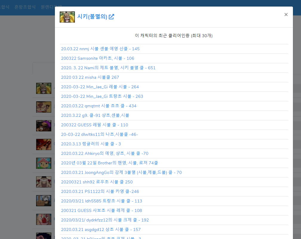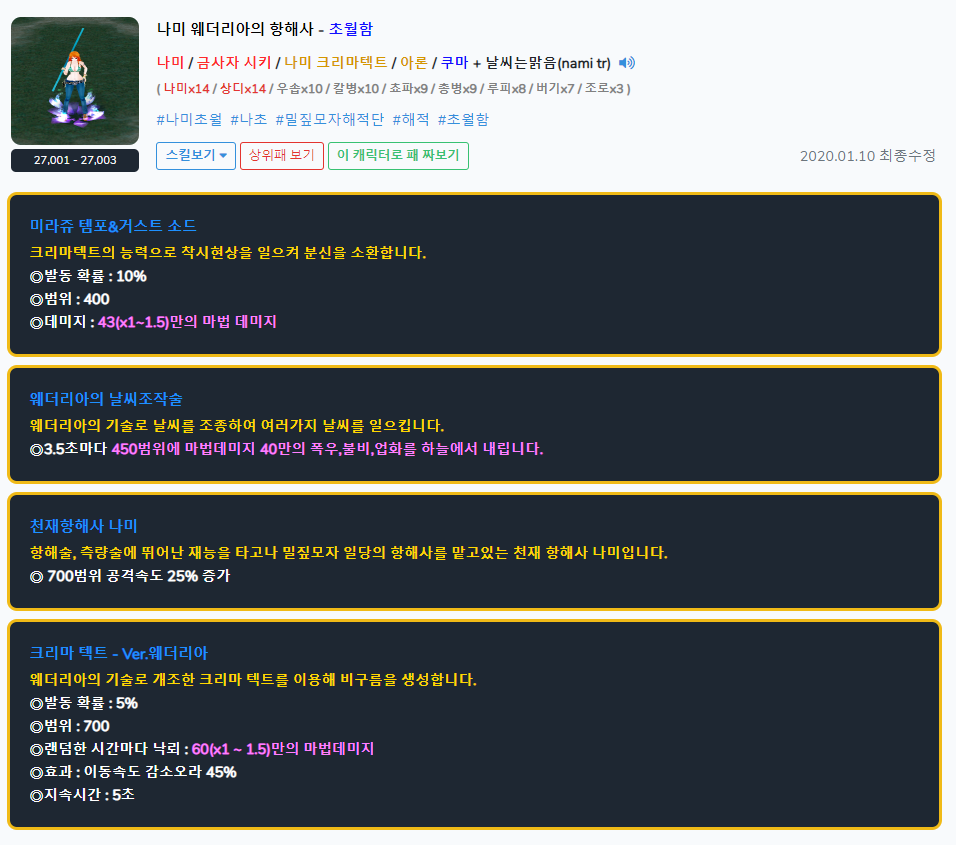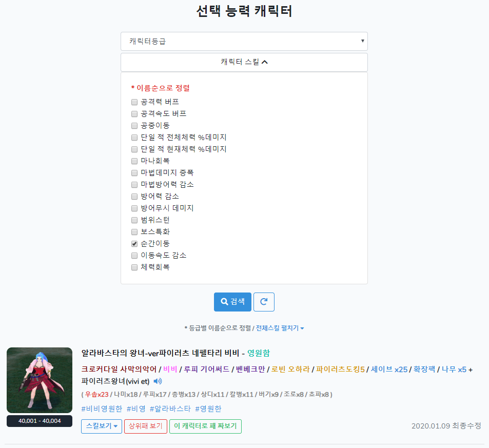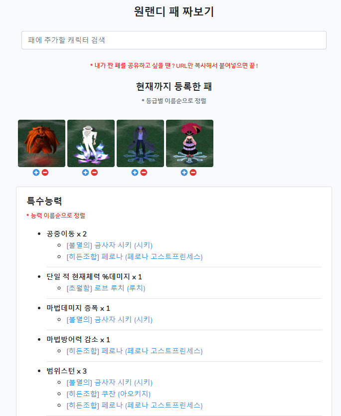 가상으로 패를 짜볼 수 있는 메뉴이다. 재미로 만들어 봄 ㅋㅋ 패를 짜면 해당되는 모든 캐릭터들의 모든 스킬이 합산되어 볼 수 있도록 해 두었다.