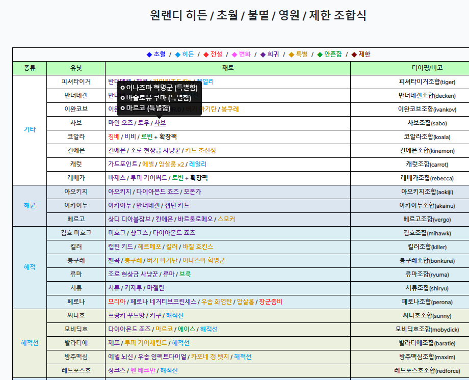 위 조합식의 흔함 버전이다. 특정 흔함 캐릭터(유닛)를 보고 싶을 때는 조금 보기 힘들어서 특정 흔함 캐릭터(유닛)를 선택하면 강조표기가 되도록 해 두었다.