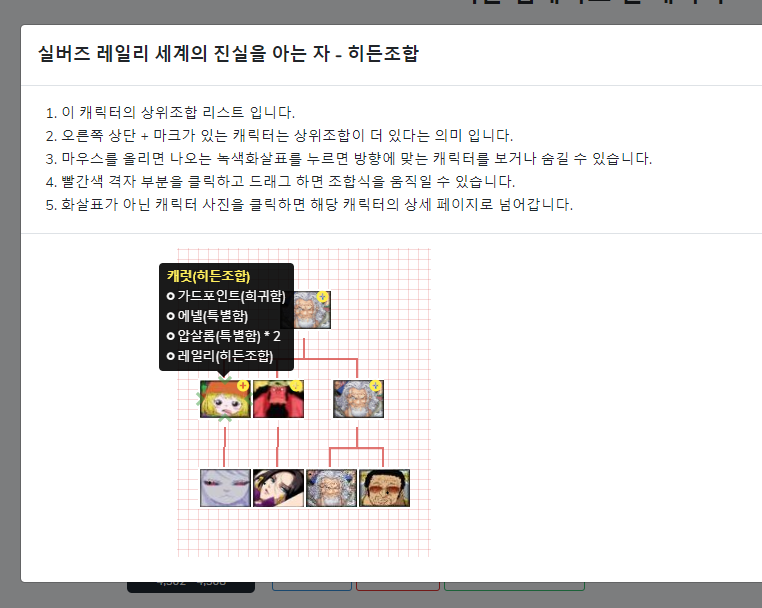 공식 카페에 있는 조합식을 조금 더 보기 편하게 만들었다. 각 캐릭터들을 누르면 상세 정보 페이지로 이동하며 하위 조합 캐릭터(유닛)에 마우스를 올리면 해당 캐릭터(유닛)의 조합식이 출력되게 하여 조합식을 까먹었을 때 유용하게 쓴다.