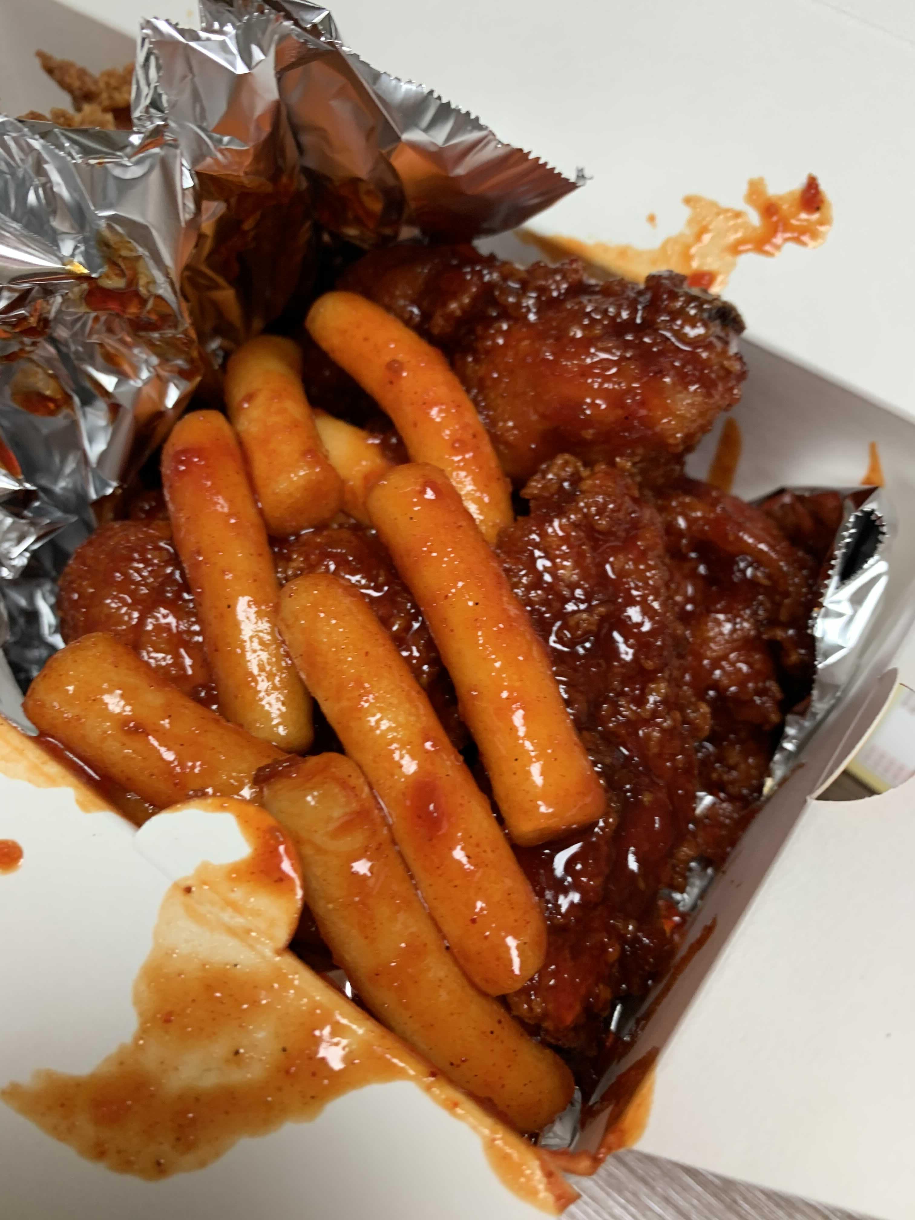 여긴 핫양념. 핫양념은 맛도 물론이지만 느끼할 수 있는 치킨맛을 완벽히 제거해주는 역할이 크다. (떡은 서비슨데 겁나 많이 주심)
