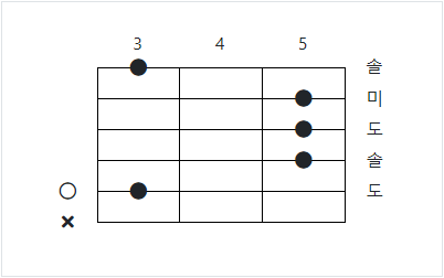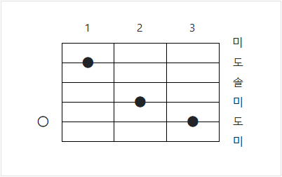 ※ 자주 쓰이는 운지법 (이미지 위 숫자는 프렛 번호이며, 위에서부터 아래로 1~6번줄 순서)