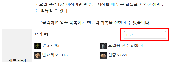 특정 요리를 대량으로 만들 때 보통 만들고자 하는 양만큼 계산해서 재료를 꺼낸다. (전부 꺼내기엔 무게가 ... ㅠㅠ) 예를들면 맥주를 1000번 만들고자 하면 각각의 재료 수 만큼 1000을 곱해서 재료를 꺼내야 한다. 한 번 만들 때 재료가 곡류 5개, 요리용 생수 6개, 발효제 2개, 설탕 1개니까 .. 어디보자 .. 곡류가 5개니까 5,000개 요리용 생수가 6개니까 6,000개 발효제가 2개니까 2,000개 설탕이 1개니까 1,000개 이런식으로 계산을 해서 꺼내는데 10단위는 사실 계산이 쉬워 암산으로도 가능하지만 애매하게 561개, 159개 이런식으로 10단위가 아닌 경우 계산이 매우 귀찮다. 일일이 계산기 하나씩 쳐가면서 해야되서 조금 더 편하게 구할 수 있는 방법이 있을까 해서 제작노트에 간단한 기능을 추가해 보았다.