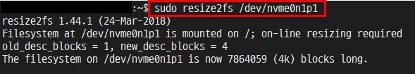 터미널에 sudo growpart /dev/nvme0n1 1을 입력하면 뭔가 변경되었다고 나온다. 그리고 disk 이름 앞에 /dev 를 붙여줬는데 아무래도 df -h 명령어 결과에서 파티션 이름 앞에 /dev 가 붙어 있는걸로 봐서 /dev/{disk 이름} 으로 해줘야 되는 것 같다. (/dev 안붙이면 찾을 수 없다고 나옴) 다시 df -h 로 확인해보면 ... 그래도 적용이 안되어있다 ㅠㅠ