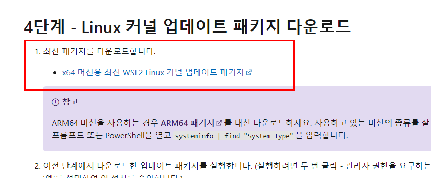 docs.microsoft.com/ko-kr/windows/wsl/install-win10#step-4---download-the-linux-kernel-update-package