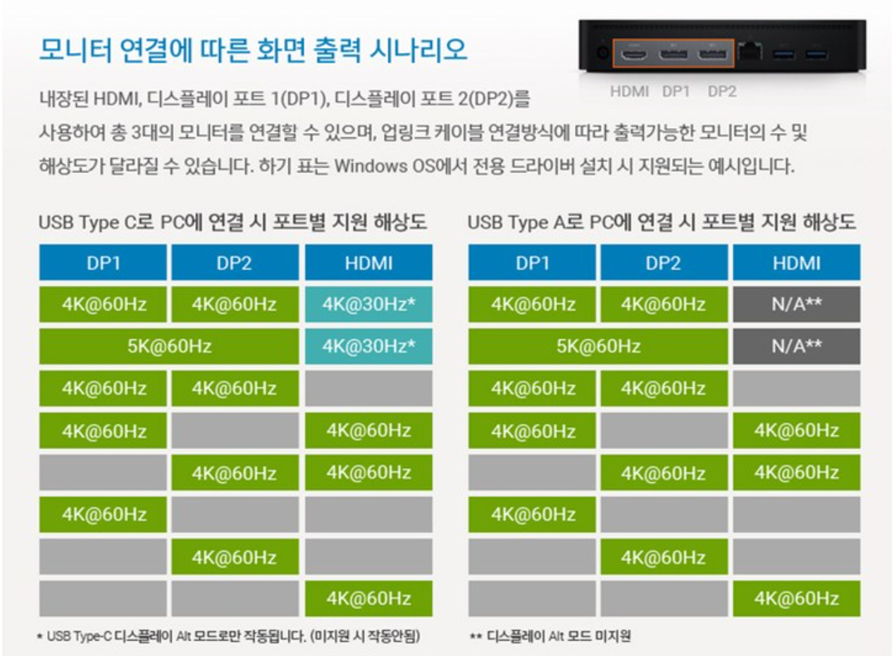 이 또한 유명한 Dell 에서 나온 도킹스테이션이다. 가격은 쿠팡 기준 267,030원. (벨킨보다 좀 더 비쌈) 벨킨과 동일하게 displayLink 기능이 적용된 제품이고 대부분 동일하지만 큰 차이점은 바로 모니터 출력이 4K 까지 지원가능하다는 점이다. (이 제품을 먼저 알았다면 그냥 이걸 바로 샀을텐데 .. ㅠㅠ) 그리고 출력이 전부 HDMI가 아니라 DisplayPort를 함께 써야되는 것도 차이점이다. (다중 디스플레이 출력 시나리오는 아래 표 참조)